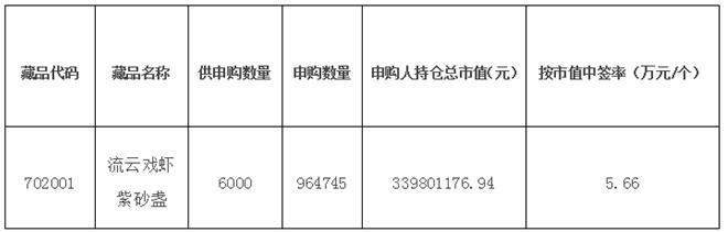 本次中簽分配方式按持倉市值搖號中簽,請廣大參與申購的投資會員關注交易賬號中持倉數(shù)量和資金變化情況。《流云戲蝦紫砂盞》將于2017年1月19日正式掛牌交易。